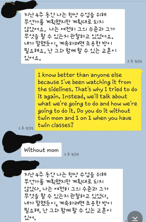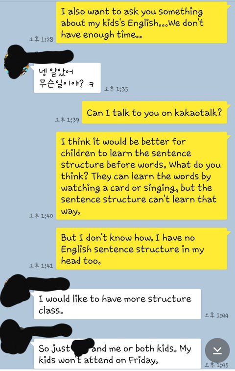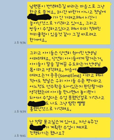 그래서 요즘 아이가 많이 피곤해해서 시간대를 옮기면 좋겠다고 얘기하면서 수업 방식을 얘기했어요.