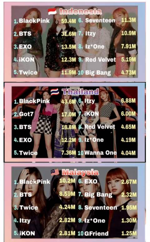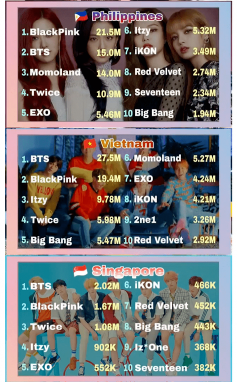 그리고 태국, 인도네시아, 말레이시아, 필리핀 동남아쪽은 블핑이 1위