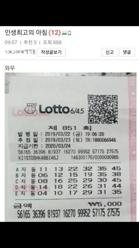 지난주 로또 1등 인증올라옴 ㄷㄷㄷㄷ