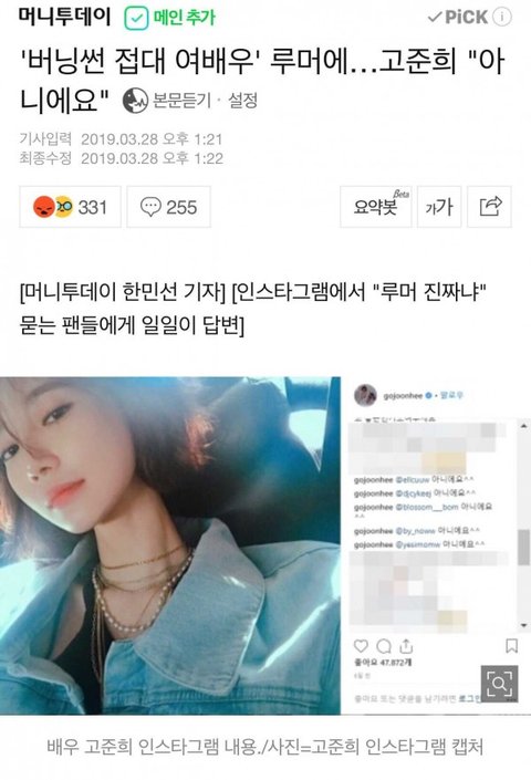 오늘 올라온 버닝썬 승리 관련 기사 원문엔 고준희 관련내용 하나도 없는데 막컷에 고준희랑 승리 같이 찍은 사진 넣었더라. 이제 아예 그 뉴욕여배우는 고준희임. 고준희는 진짜 아니라면 여배우로써 이미지에 엄청난 타격을 이미 입었으니 고소해야 될듯.