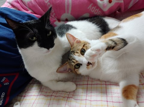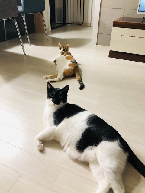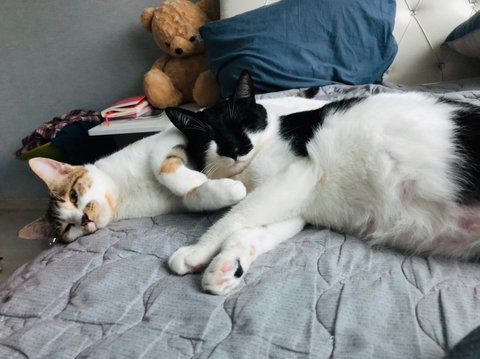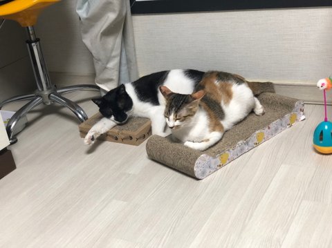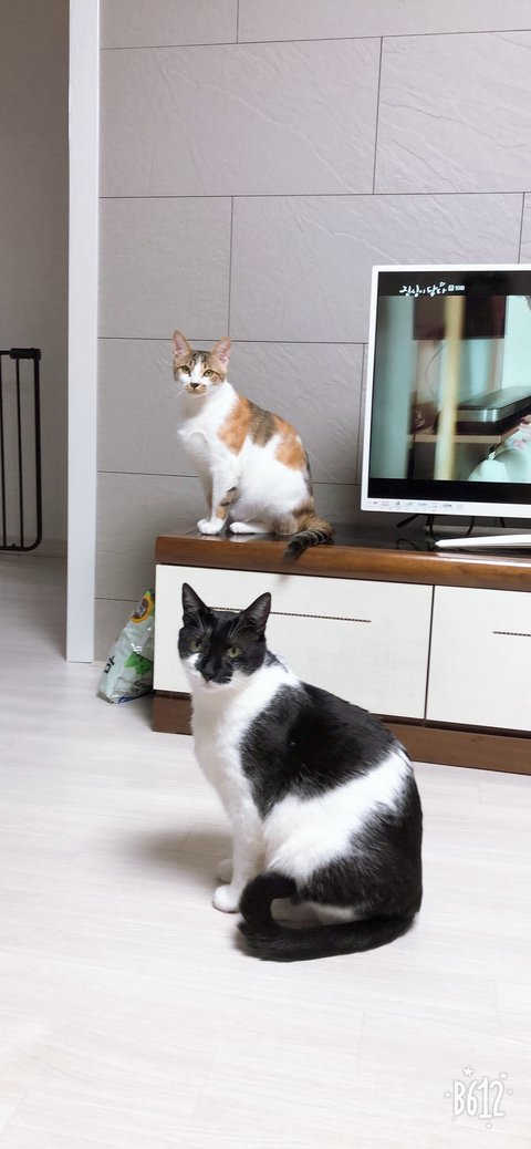 둘다 길에서 데려온 욕고(욕심쟁이고양이)와 꼬맹이에요~ 데려온지 2년 1년반 정도됐네요골반부러져서 박스에 갑자기 나타난애. 1년동안 빌라1층에서 밥주던애 이사오면서 데려왔답니다