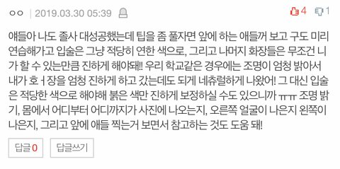자기가 평소에 바르는 입술로 입술을 다 채우지만 자연스럽게 해야해 진짜 안그러면 아줌마처럼나와서 나중에 후회할거같아