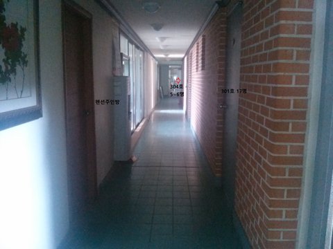 열어놓고 서있던 심선배가 잠시 나오라고 하여 슬리퍼 신고 현관을 나가는 순간 301호 현관문 옆 복도에 숨어있던 304호 묵은 심 선배일행들이