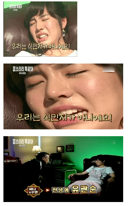 방송 전체로 보면 전생최면 전에 유관순 연상시키는거 보여줘서 전생으로 유관순 나오게한 실험한거임. 저부분만 짤라놓으면 웃기긴한데