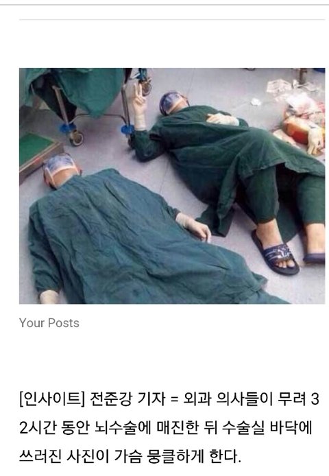 베플에 있는 머리 손재주 순발력 받고 끈기,체력까지 플러스 되야해 수술이 짧아도 1시간은 걸릴거고 보통 5~8시간씩 한자리에서서 초집중상태로 버텨야함 아래짤은 32시간동안 쉬지도않고 수술한후 뻗은 의사들이래ㅠ 저시간동안 잠 안자는것도 힘든데 서서 눈에 보이지도 않을 혈관같은거 특수렌즈같은걸로 보면서 초집중상태로 하루넘게 버틴거임ㅠ 잘보면 옷이 땀 범벅임 의사는 아무나 하는게 아닌듯ㅇㅇ