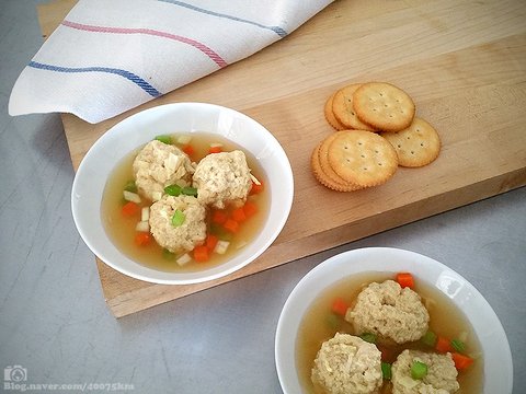 동양식 닭고기 완자 수프. 고기 경단을 만들면서 리츠 크래커를 갈아넣어서 반죽했습니다.