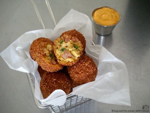 피망, 양파, 햄을 넣고 만든 오믈렛을 경단처럼 모양 잡아서 튀겨낸 음식입니다.