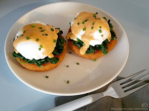 그 위에는 시금치와 수란, 그리고 홀랜다이즈 소스가 들어가지요.