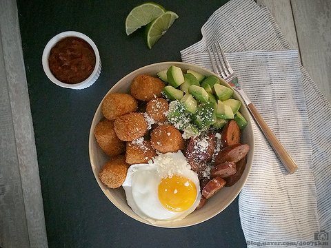 멕시코식 초리조 보울. 달걀 후라이, 초리조 소시지와 아보카도, 테이터 톳(Tater tot)에 소스를 뿌려 먹는 음식입니다.