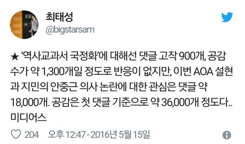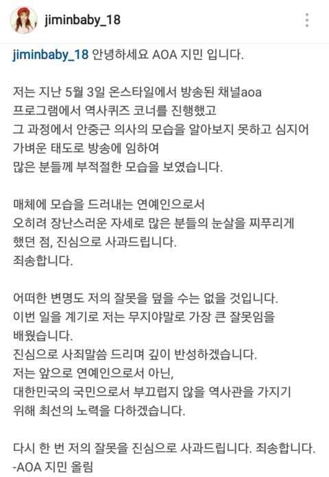 내 기억상으로 그때 논란이 생겼을 당시는 한창 에오에가 잘나갈때였고 설현, 지민을 별다른 이유 없이 싫어하는 악플러들이 활개를 치던 때라 논란 터지고 사람들이 '이때싶, 잘 걸렸다' 이런 마인드로 마치 악플을 달 당위를 부여받은 것 마냥 욕을 해대서 잘못에 비해 너무 과한 질타를 받는 거 아닌가 싶었는데..