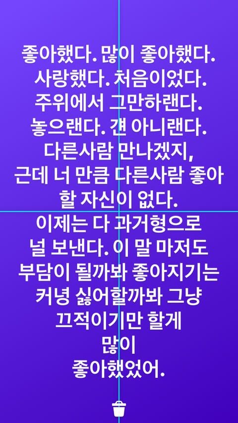 그만해. 포기해. 요즘 부쩍 많이 듣는 소리 10년동안 다른사람 생각 못해왔는데 당연히 난 앞으로도 못할거야 근데 포기하긴 할래 너의 인생의 내가 없는건 확실해 나의 인생엔 너가 전부였고 짝사랑 진짜 내가 할줄 몰랐는데 사랑알려줘서 고마워 누구를 이렇게까지 좋아해본적 없어 너가 처음이니깐 그리고 마지막일테니깐 나도 다른사람 만나겠지 근데 이만큼 좋아할 자신이 없어. 난 니가 행복했으면 좋겠어 잘 지내 내 인생한켠의 찾아와줘서 고마워 정말 많이 좋아했었어. 안녕.