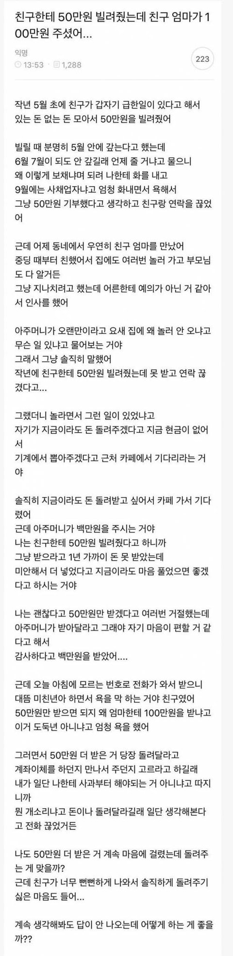 친구한테 50만원 빌려줬는데 친구 엄마가 100만원 주셨어