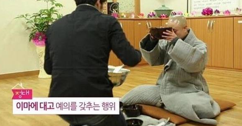 음식을 받은 후 그릇을 들고 정대(이마에 대고 예의를 갖추는 행위)를 하는데