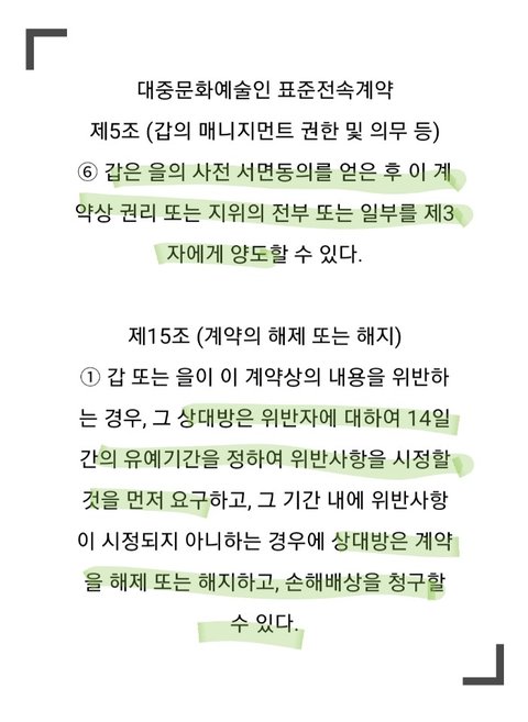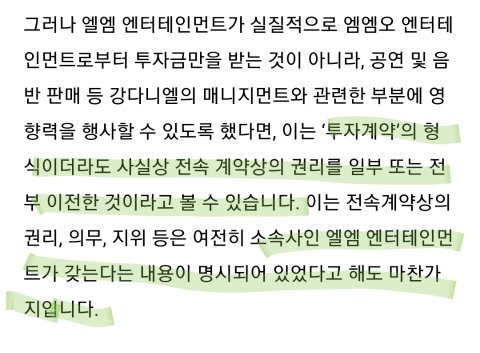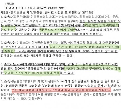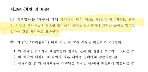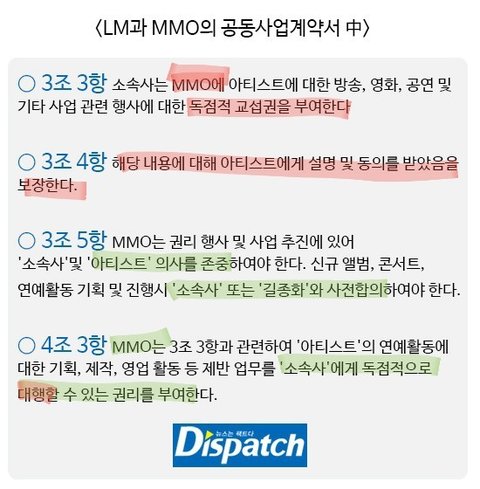 -그리고, 4조 3항에서도 MMO는 독점적 교섭권을 가지고 있는거고, LM에게 연예활동에 대해 대행권을 주는 것 뿐이지, 그렇다고 MMO에게 양도된 교섭권이 돌아오는게 아님. 실질은 여전히 양도 계약