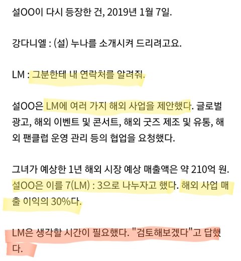 -이걸 LM이 자기들이 엠엠오랑 공동사업한다는 근거라면서 디스패치에 넘긴것. 즉 19년 1월 28일 공동사업 계약 체결 전에도, 팬미팅 계약일인 1월 11일 이전에도 판 만들어 교섭권 써서 팬미팅 계약까지 했다는 얘기.