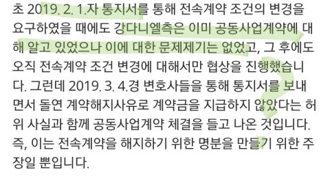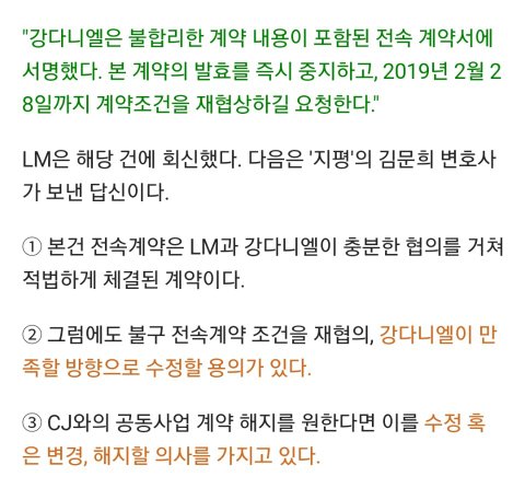 -27일엔 강다니엘이 2월1일 보낸(2월28일기한) 첫 내용증명에는 공동사업계약에 대한 문제제기가 없었다가 3월4일 되서야 ‘갑작스레’ 공동사업계약 얘기 꺼냈다고 함. 그러나 디스패치를 보면 이 2월 내용증명의 회신에서 LM이 공동사업계약 수정에 대해 언급하는 내용이 포함됨. 디스패치가 맞다면 27일 기사는 거짓이고 2월1일이나 3월 4일이나 계속 공동사업 계약 수정을 요구 했던것. 하도 언플하다보니 초기의 본인들 주장도 까먹은 셈