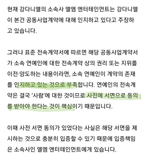 -또한 계약에 제3자에게 권리를 양도하는 내용이 있다면 그 계약에 대해서 아는것으로는 부족하고 "서면 동의"가 필수임. 그런데 강다니엘은 이 계약에 대해서 알지도 못했고, 소속사는 강다니엘 동의도 안받은것. 이걸 증명하는건 간단함. 서면 동의서를 증거로 보여주면 됨. 근데 그게 없으니 소속사가 여태 언플하고 있는것.