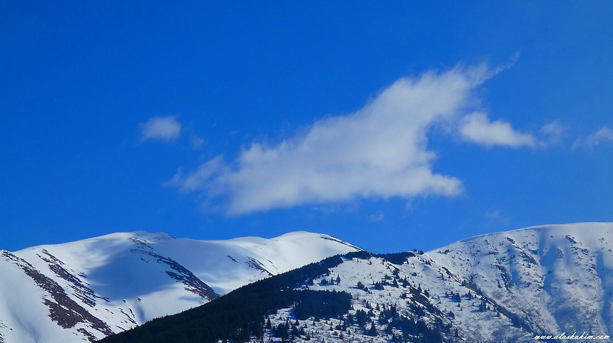 하얀 눈들이 쌓인 설산들과 그 설산 머리 위를 오가는 작고
