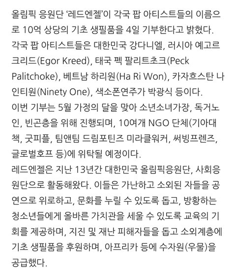 레드엔젤팀이 각 나라의 가수 이름으로 기부한다는 얘기야. ㅎㅎ