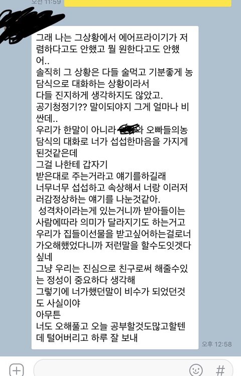 그 자리에서 어려서 몰랐다는 이유로 씀씀이 차이를 둔게 속이 상했다. 속이 상하니까 너가 진심으로 못도와줘서 미안하다는 예쁘게 쓴 글은 안보이고 그냥 내 말만 하게 되었다. 너 말처럼 상대방이 기분 안좋은데는 다 이유가 있는데 너도 이유가 있는거 같고 나도 이유가 있는거 같다. 무튼 내 생각엔 그날 다른 친구 xx가 중간역할을 잘 못한거 같다는 생각도 든다. 그 친구한테는 따로 내가 연락해 입장 전하겠다. 각자 마음가는대로 축하하며 형평껏 선물하면 될것을. 괜히 좋은 날 속상하게 이러지 말고 우리 서로 이해하고 풀자. 라고요..