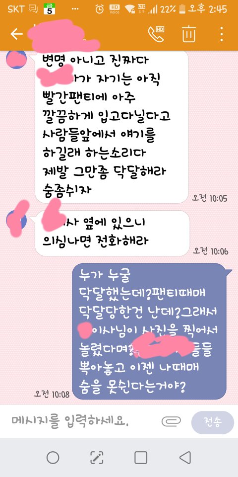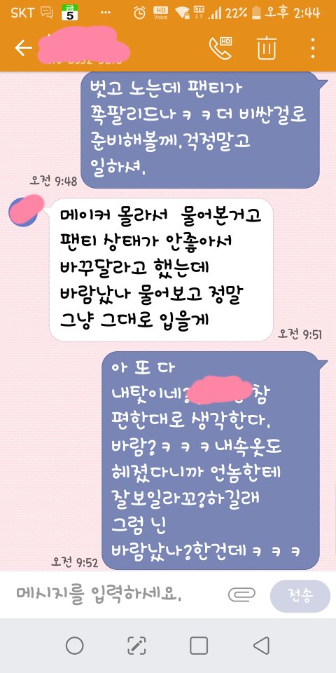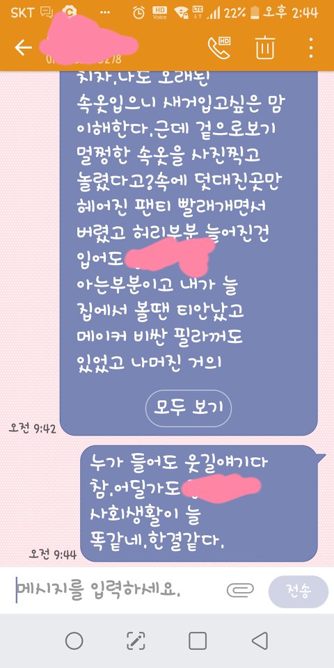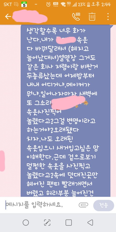 문자에 이사님은 참고로 60대후반이시고요.저희 신랑 사장님이십니다.비싸다는 필라속옷은 5~6만원대 제가 기념일마다 선물로 준것들이고 나머진 홈쇼핑서산 필라속옷들이랑 캘빈꺼구요.속옷이든 뭐든 넉넉한걸좋아해서 많은 편입니다.결혼후 제입장에선 비싸지만. 다른분들은 한장 5~6만원대 남자속옷 비싸다고 생각안하실수도 있을겁니다.요즘 술자리가 많고 노래방도 자주가는거같고 엊그제도 노래방다녀왔다했구요.집서 15분거리 회사지만 숙소서 자고올때도 있고요.2주전쯤 말없이 외박하고 숙소서 자고 왔구요.왜 메이커사줬는데도 자꾸 묻고 또 묻냐니까 이사님이 자기 자는데 사진찍어서 사람들한테 보여주며 비웃는다고해서 제가 확 터진거구요.건설사간뒤로 힘들고 스트레스받는거아니 잔소리안합니다.제 스트레스는 애들데리고 혼자 여행도 다니며 알아서 푸는 편이고요.