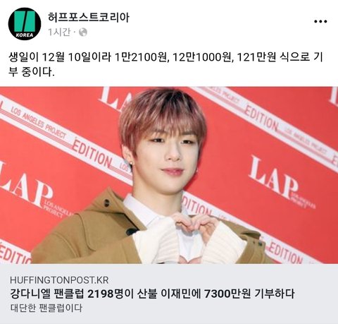 강다니엘 팬클럽 2198명이 산불 이재민에 7300만원 기부하다