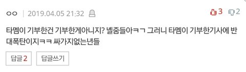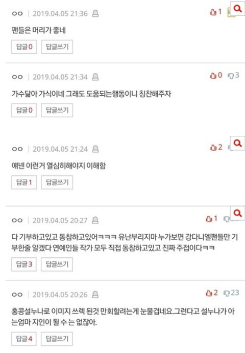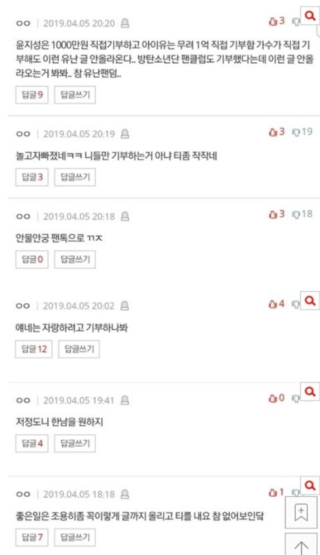 다른 글도 아니고 기부글에 들어와서 이러는건 좀 아니지 않아? 더 심한것들도 있었는데 하.. 가수 생각해서 여기까지..