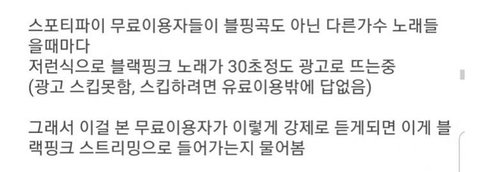 저딴 정책이 있는 스포티파이가 제일 놀랍네 스킵도 안되는 광고 걸어놓고 30초 들으면 1회 카운트 인정~ 딴가수 노래 강제로 듣기 싫음 유료 전환해라니;;;저런 프로모 제도 있다는거 자체가 놀라울뿐 방탄팬들이야 당연 열받겠지 내가수 스밍했는데 강제로 타가수도 카운트된다니ㅋㅋ입장 바꿔서 블핑 뮤비에 스킵 안되는 30초짜리 방탄 프로모 걸어놓고 너네 뮤비볼때마다 방탄도 덩달아 조회수 1회 인정 이러면 난리날걸ㅋ자본주의 어쩔수 없는데 방탄은 이용은 이용대로 당하고 언플에 희생될게 빤히 보여서 안타깝네