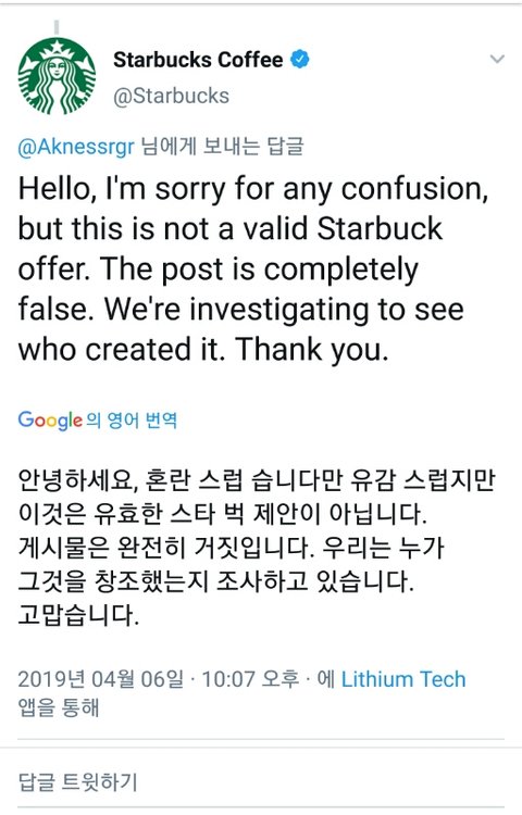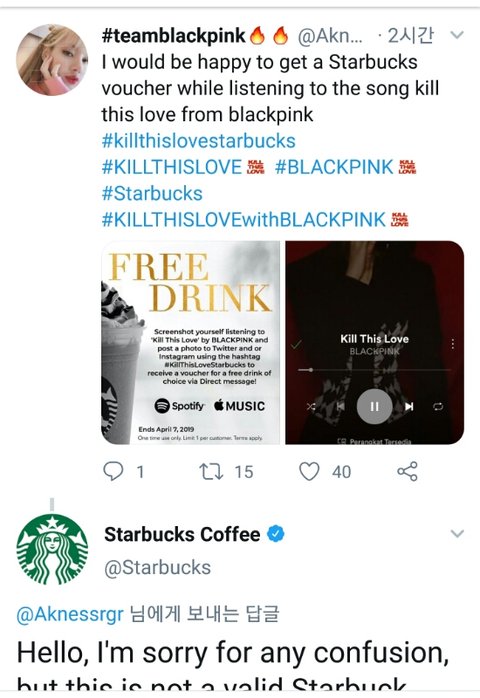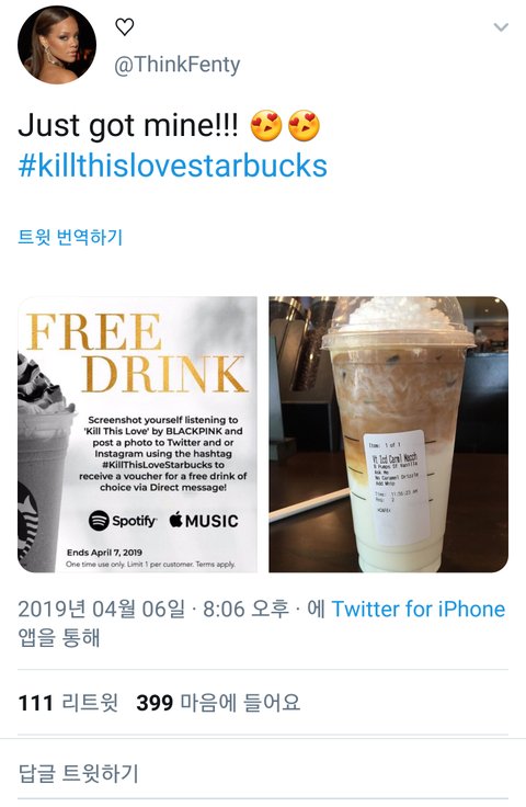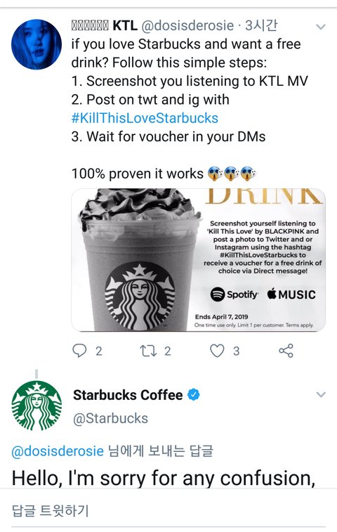 블핑팬 - 킬디럽 스포티파이 스밍하는거 캡쳐해서 스타벅스한테 보여주면 꽁짜커피준다 스타벅스 - 조카 날조임 개당황; 누가 날조한건지 찾아내겠음 꽤 여러팬들이 올렸는지 공계에서 계속 복붙해서 답변중임