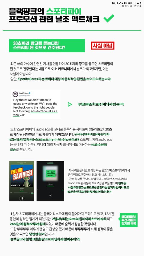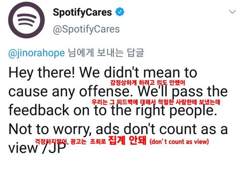 방탄팬들 이제 날조하다 걸리니까 스포티파이 *방탄 음원*에만 블핑이 광고하고 있다고 날조하고 있는데 광고는 *모든*음원에 다 적용되는거에요 ㅋㅋㅋㅋㅋㅋ