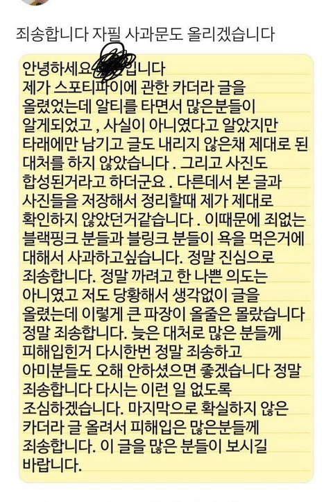 어제 추천 2000가까이 받고 톡선 간 블랙핑크 스포티파이 기록에 대한 루머글 트위터에 올린 아미가 팩트체크 당하고 공개사과함