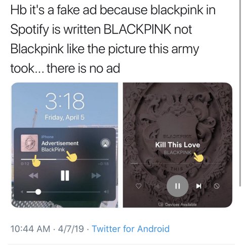 *** 애초에 블핑이 스포티파이 광고 한적도 없다는 주장도 제기됨 ㅋㅋㅋㅋㅋㅋㅋ 어떤방탄팬이 스샷 날조까지 한거