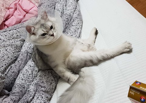 두달전 중성화수술뒤에 깔때기 끼고 멍하게 앉아있는 모습이 너무 웃겨서