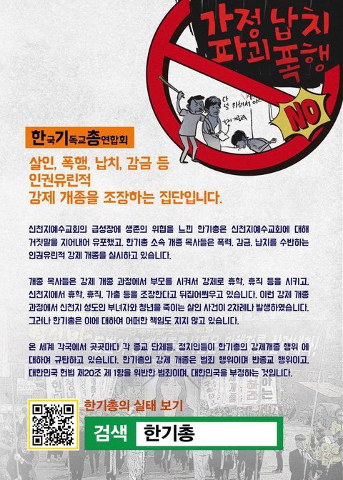 종교의 자유가 있는 대한민국에서 같은 기독교에서 기독교로,강제개종을 회심교육 또는 이단상담으로 둔갑시켜 돈을 받고 하는 곳, 돈이라면 물불을 가리지 않는 곳, 돈과 생명을 바꾸며 해서는 안될 일을 하고 있는 곳이바로 한기총 소속 교회와 목사들입니다. 이것은 어느 누가 들어도 범죄요 불법인데 개종 목사는 부모님을 시켜 일하기에 법망을 교묘하게 피해가고 있어 피해자는 더 늘어만 가고 있는 것이 현실입니다.