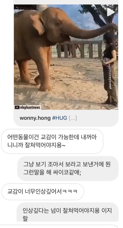 * 보낸 영상은 코끼리, 돼지, 말, 닭 등 동물과 사람이 껴안는 영상 입니다 *