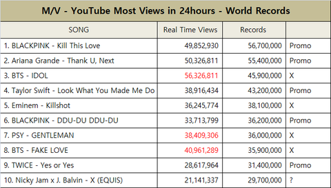 * 참고로 새 신기록을 세운 국내뮤비가 첫날부터 프로모를 했다 안했다로 의견이 갈리고 있는데, 궁금증을 해결하기 위해 프로모의 정확한 시작시간과 국가여부를 유튜브에 문의했으나 답변이 없는 상태임