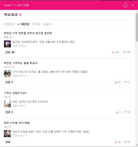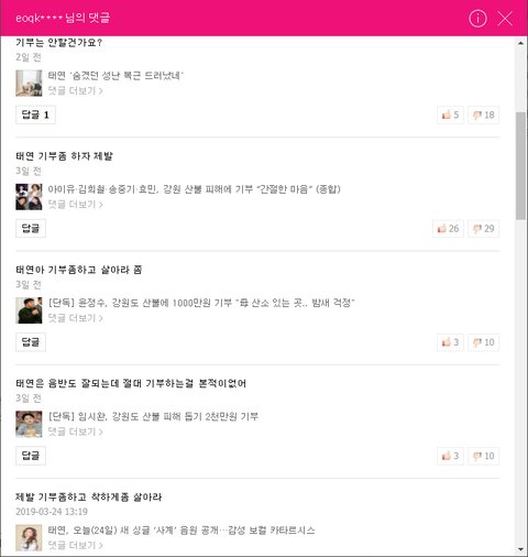기부 기사 댓글마다 태연 언급하면서 기부 하라고 댓글 담 ㅋㅋㅋ 댓글 보기도 안닫는 패기..