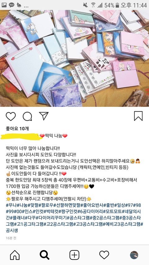 1. 어떤 인스타그램 스티커 판매자가 떡메(떡메모지)가 너무 많으니 '나눔'을 한다는 글을 올림. 내용은 수고비+교통비+우편비 등을 포함해서 1700원만 주면 떡메 40장을 준다는 것이었음.