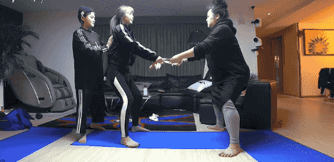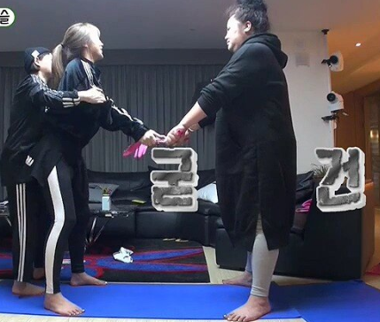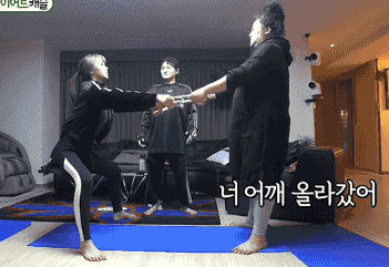 언니랑 같이 스트레칭 하는데 둘이 고무 장갑을 잡고 하는 거