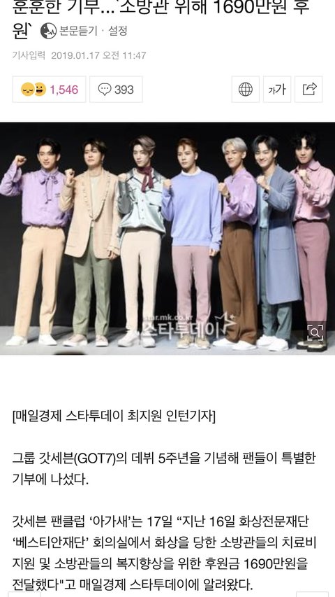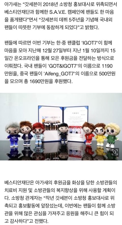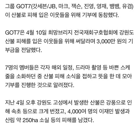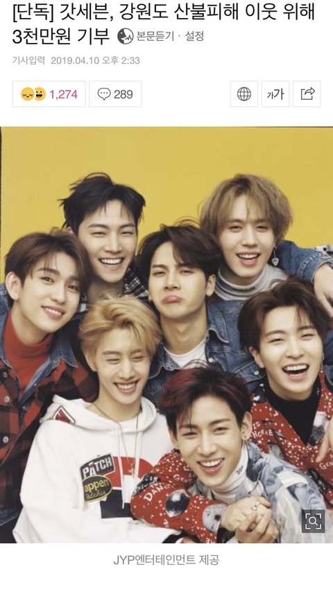 7명이 '갓세븐'으로 전국재해구호협회에 기부를 동참했다는 기사가 떴더라.