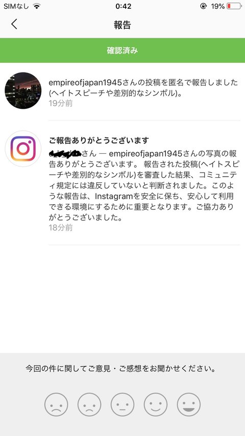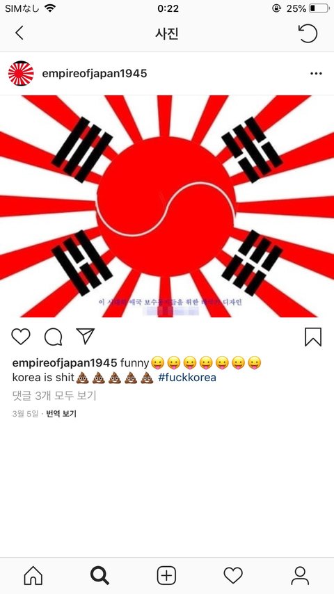 [요약]인스타에서 전범기에 태극기 합성한거 발견입에도 담기 싫은 korea...f...적혀있음편파적 발언 또는 상징으로 신고응! 이거 차별아님이라고 신고 거절