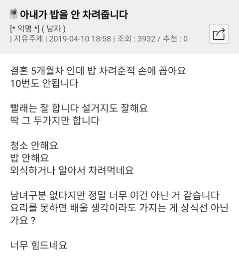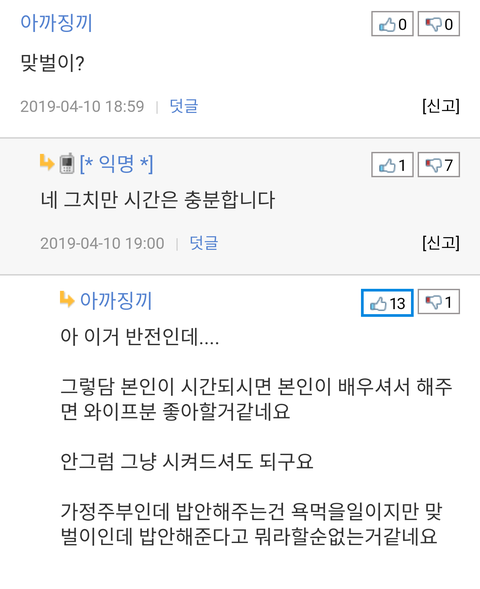 능력도 없고 바라기만 하고 ㅁㅊㄴ 아냐? 왜 여긴 맞벌인데 '아내'가 밥 안차려준 얘기만 올라오지? 이런 논리면 아내도 '남편 '이 밥 안차려준다 불만일텐데? 대부분 아내들은 알아서 먹는데 남편놈은 지밥도 못챙겨먹는 븅쉰들이라 이 ㅈㄹ하지. 내 주둥이로 들어가는거 알아서 처먹어. 이 모지라.