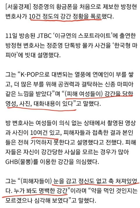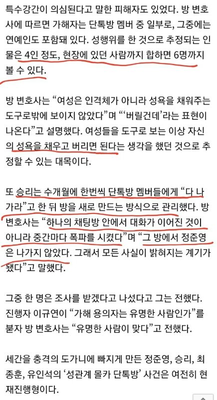 진짜 미쳤다 집단x간 까지했대 (단어쓰면 네이트에서 글삭시킴) 승리가 주기적으로 단톡방 폭파시키고 새로운 단톡방 팠음 증거인멸하려고 하지만 정준영이 안나가서 단톡방 내용 밝혀진거임