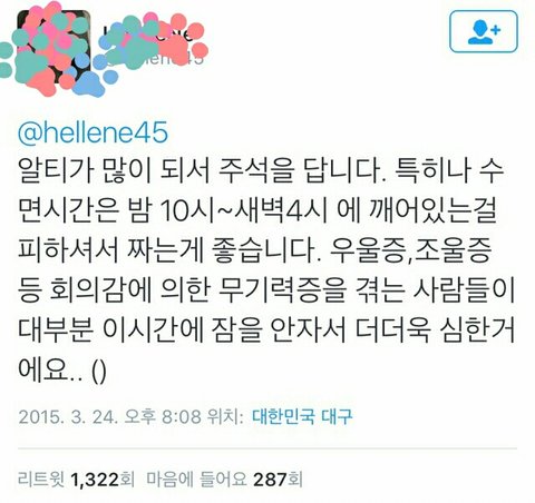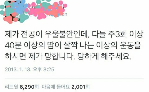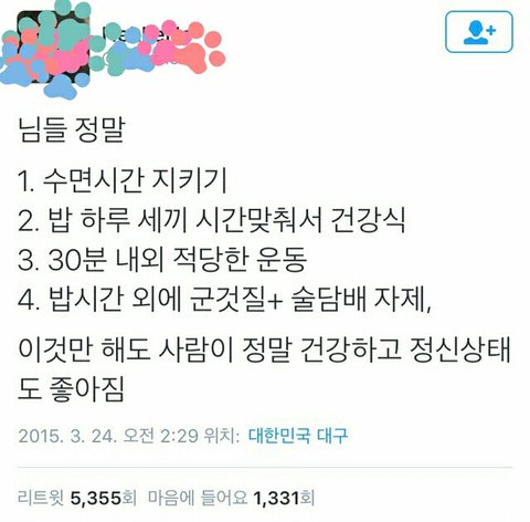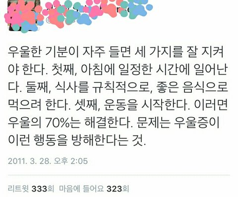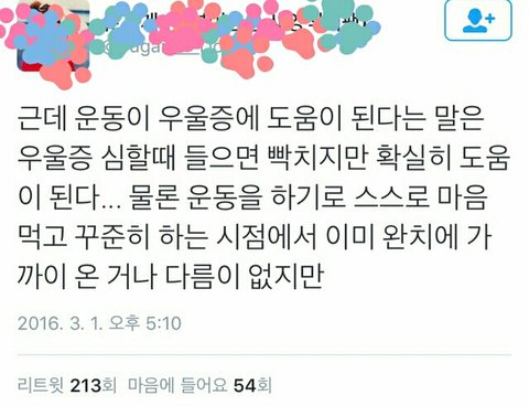 저것도 심한 우울증에는 소용없음 내가 진짜 심할때 저거 다 지켰는데도 우울증 개심했어 ㅋㅋㅋ 심하면 무조건 병원가야함 본문얘기가 의미없다는 게 아니고 약으로 치료해야하는 사람한테 야 우울증 운동 열심히하면 괜찮아 진다던데? 이런 말 하는 사람생길까봐 덧붙임..