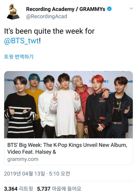 2019년 가장 화제가 된 보이그룹 방탄소년단이 최근 앨범 '맵 오브 더 소울: 페르소나'를 출시했으며, 시장을 발칵 뒤집었다. K-pop의 왕들은 오랫동안 기다려온 앨범과 함께 그래미가 지명한 가수 할시가 등장하는 싱글 "Boy With Luv"에 뮤직비디오를 공개했다. 2개의 언어로 이루어진 (한국어╋영어라는 뜻인듯) "Boy With Luv"는 현재 3천만 회 이상의 조회수를 기록하고 있다. 이 영상에는 다양한 핑크 계열의 옷을 입은 제이홉, 진, 브이, 정국, 지민, 슈가, RM과 핑크색 머리를 한 할시가 춤을 췄으며 할시는 함께했던 그 상황을 긍정적으로 트위터에 포스트했다. 간단히 해봄 여튼 결론은 방탄짱짱맨뿡뿡이라는 뜻