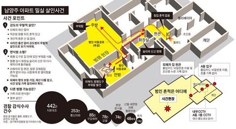 "아파트 A동으로 들어갈 수 있는 입구 역시 입주민은 출입카드나 비밀번호를 이용해야 하고, 외부인은 출입하려는 호수에 직접 연락해 안에서 문을 열어줘야 하지만 피해자의 집 호수를 누른 외부인이 없었다. 아파트 안으로 들어올 수 있는 같은 동 주민이거나 다른 집을 방문하는 것처럼 속였다고 가정도 해봤다. 그러나 사건 당일 오전 5시부터 자정까지 A동 출입구, 엘리베이터 내부, 1층 엘리베이터 앞 CCTV 등에 찍힌 188명의 당일 행적을 이 잡듯이 뒤졌어도 범인의 흔적은 찾지 못했다. 계단을 이용했더라도 1층 엘리베이터 앞 CCTV에는 모습이 찍힐 수밖에 없는 구조였는데 역시 특이점은 찾아볼 수 없었다." (출처 나무위키 https://namu.wiki/w/%EB%82%A8%EC%96%91%EC%A3%BC%20%EC%95%84%ED%8C%8C%ED%8A%B8%20%EB%B0%80%EC%8B%A4%20%EC%82%B4%EC%9D%B8%EC%82%AC%EA%B1%B4 )