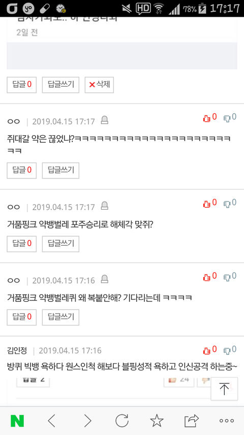 네이버 에서 악플쓰다가 평소 처럼 추천안박히고 욕먹으면 원스로 물타기하다가 갑자기 전혀없던 무개념원스들 파티.둔갑술 인즈엉