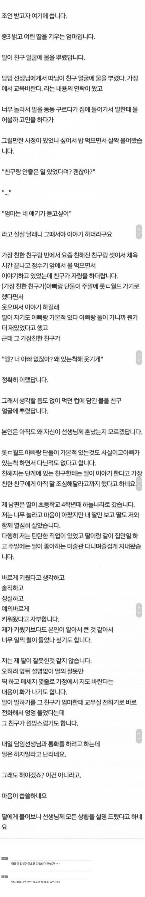 이건 따님의 자존심 문제입니다 꼭 교무실찾아가서 큰소리로 말씀 다하시구요 선생님께도 사과 받아야하고 그친구한테도 공개적인 사과 받아야합니다 상처난 자존심은 시간이 지나도 상처로 계속 남아있습니다.. 상황이 있는 지금... 그걸 풀어주셔야 아이가 상처없이 건강한 생활..마음을 가지며 자랄수있어요.. 이건 엄마이기때문에 꼭 아이를 위해 해주셔야해요