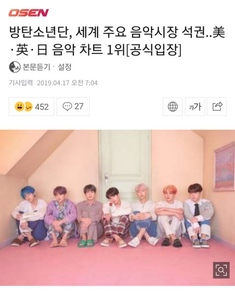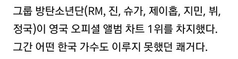 빌보드도 대단한거지만 영국차트가 대박임. 좀 다른나라 가수들한테 차별(?) 그런게 있어.노래도 잘 안틀어줌 라디오 뚫을때 영국아미들이 엄청 고생함. 근데 거기서 1위한거야 이건 정말 대단한정도가 아님