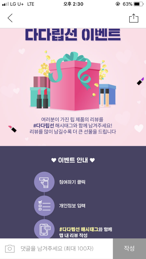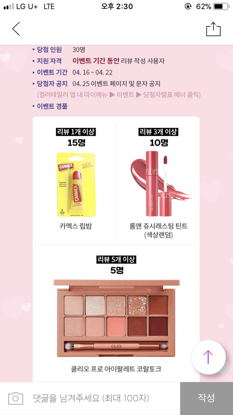 근데 뭔가 저셋중에 롬앤 립이나 클리오 아이팔레트 노리고 리뷰작성하는사람 많을듯...ㅠ